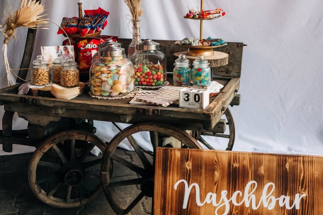 Naschbar-Set mit Gläser, Leiterwagen, Zangen, Etagere, Holzschild